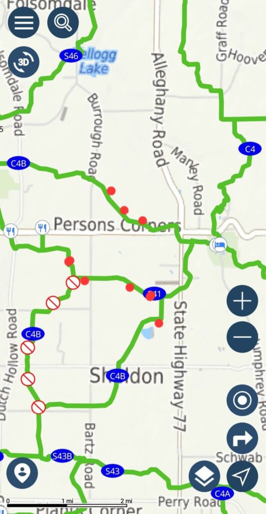 The red dots indicate driveways for the wind mills that our trails cross. These aren’t every driveway on our system but a idea of how many there are.
